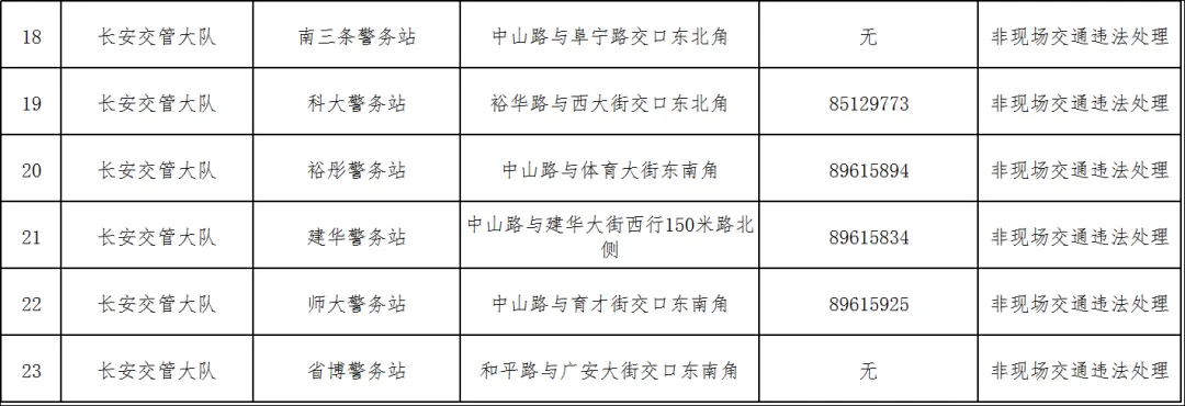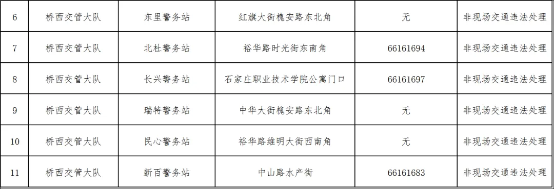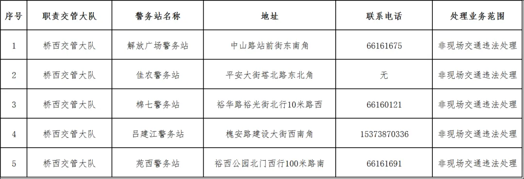 为进一步优化交管服务资源配置,提升业务办理效率,方便广大交通参与者就近办理交管业务,依据《中华人民共和国道路交通安全法》《道路交通安全违法行为处理程序规定》等法律法规,石家庄市公安局交通管理局对全市警务站非现场交通违法处理业务进行梳理调整。现将保留业务办理资格的警务站名单及相关事项通告如下: