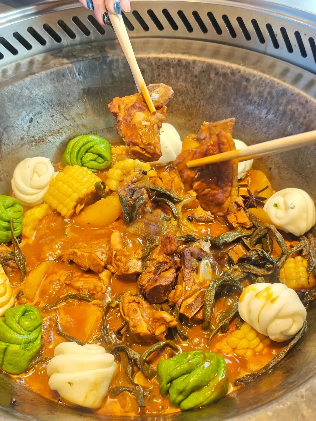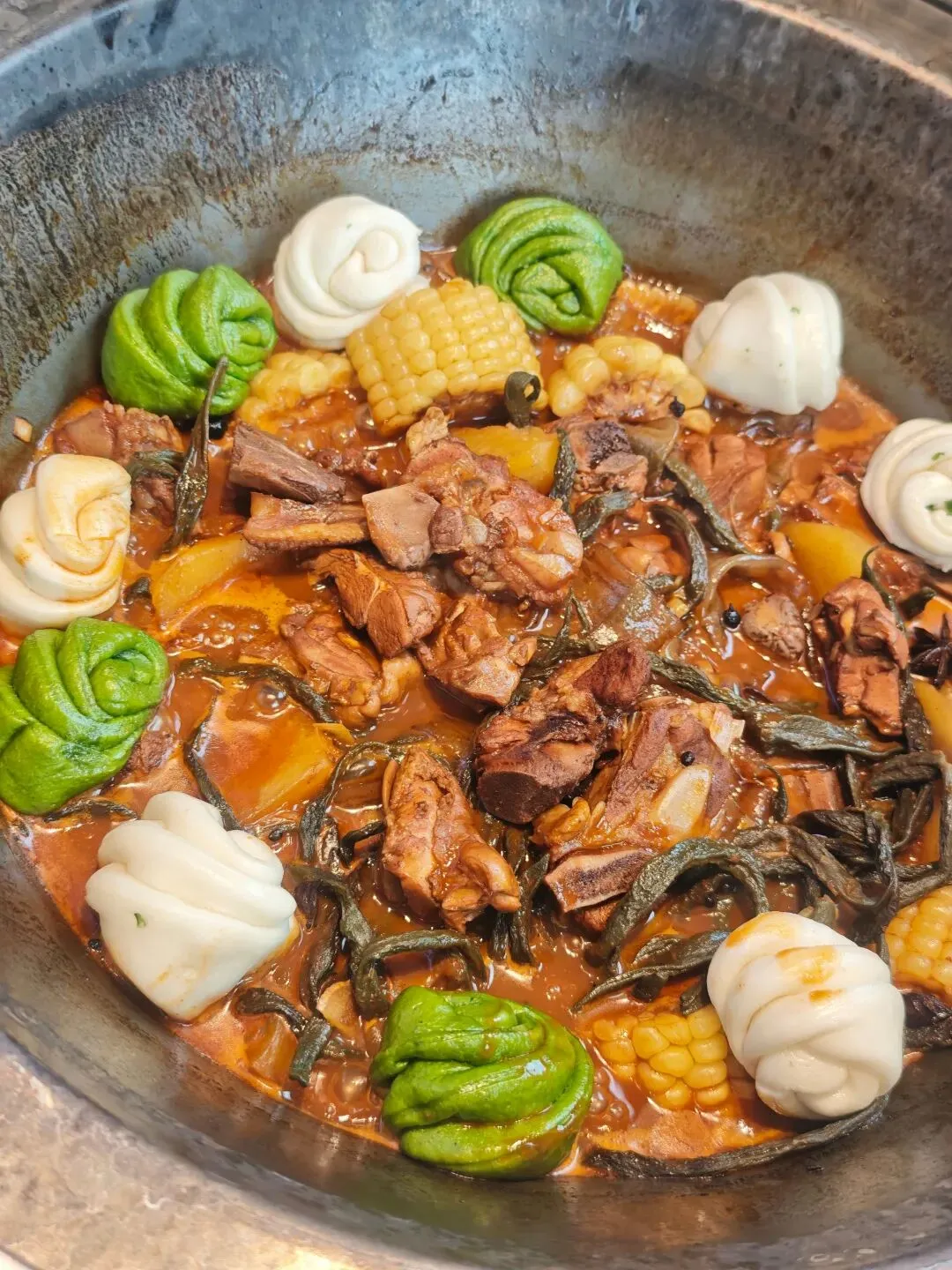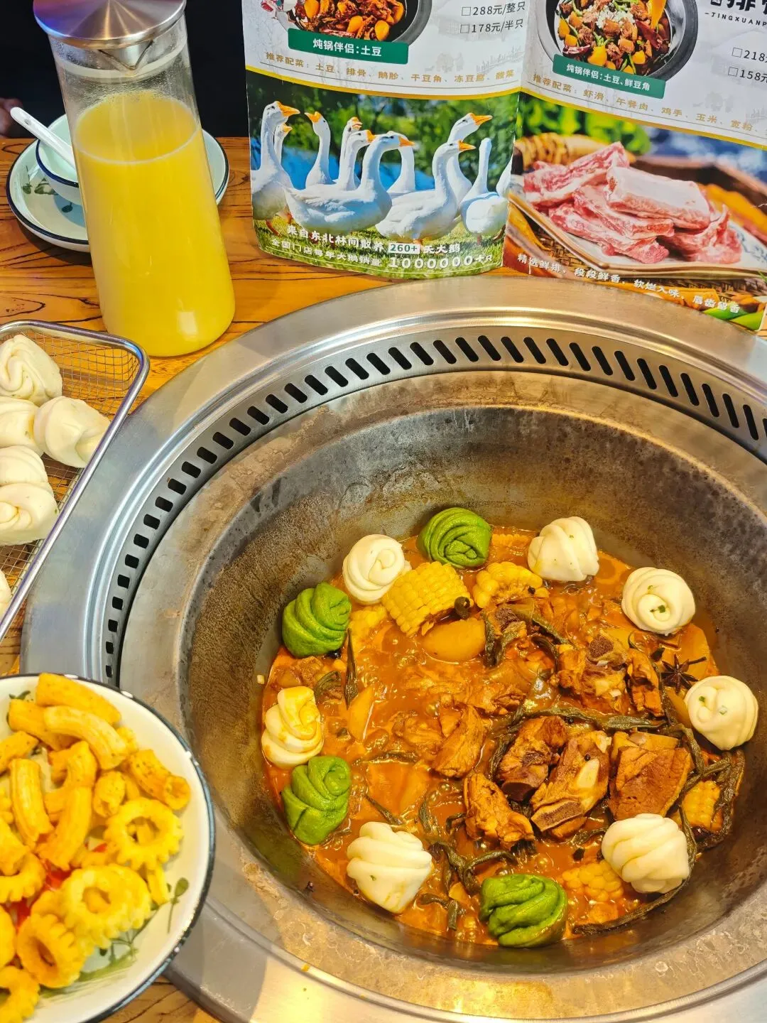 大块排骨软烂脱骨,鸡腿肉嫩到飙汁,土豆吸饱了肉香一抿就化~一定要夸这个玉米和粉条,炖得超级入味,酱香浓郁带着微微甜辣,越吃越上头!