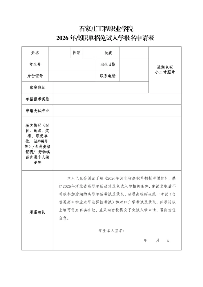 附件:石家庄工程职业学院2026年高职单招免试入学报名申请表