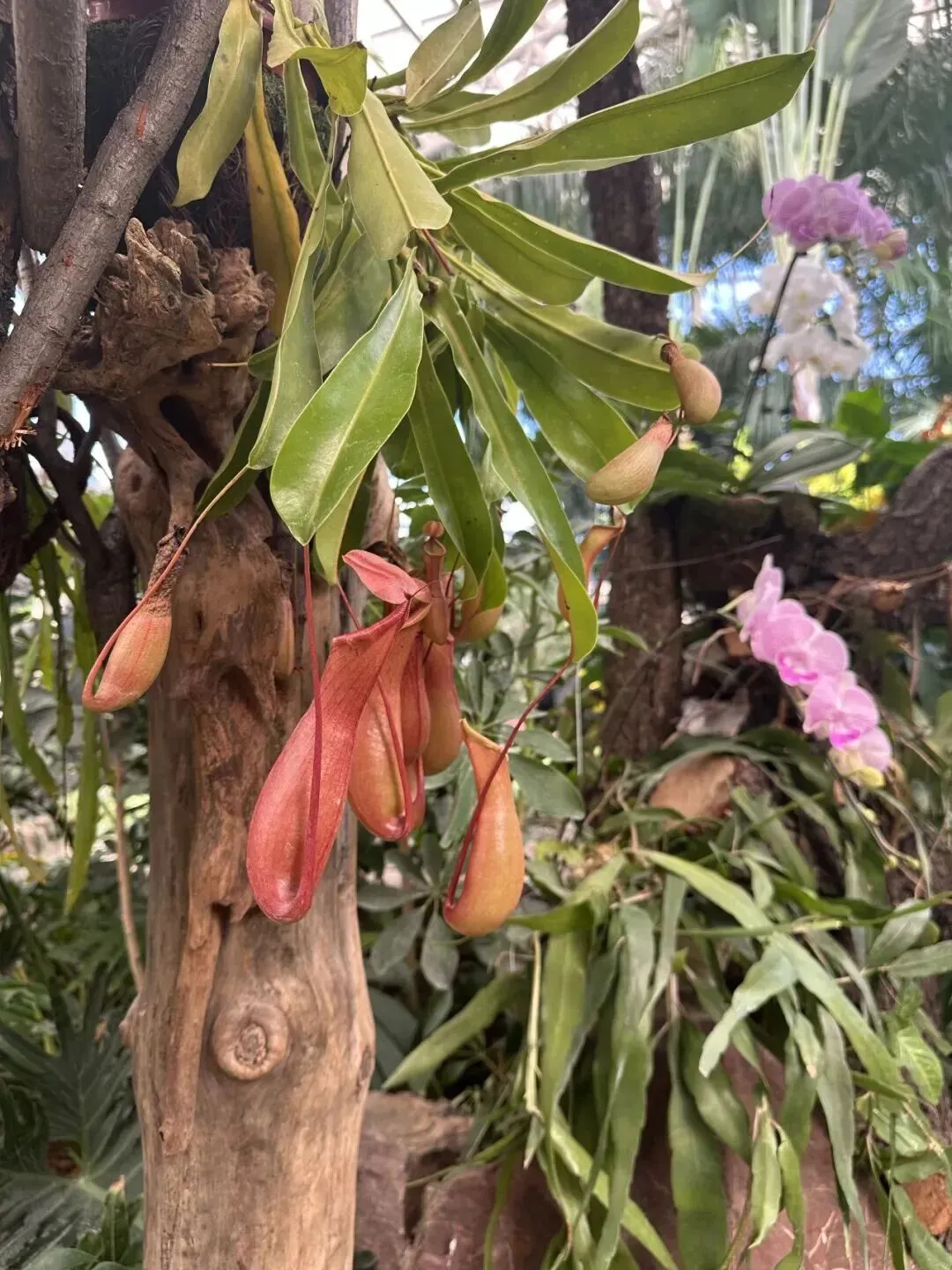 热带植物馆食虫植物区展出了10余种珍奇兰花,有形态奇特的兜兰、高贵迷人的万代兰、艳丽无比的卡特兰、可爱俏丽的文心兰以及珍奇宝贵的树兰、火焰兰、狐尾兰等,美丽奇特的兰花异香扑鼻,各展风姿。猪笼草、瓶子草、捕蝇草、茅膏菜等10余个品种的食虫植物也在这里惊艳亮相,带领游客探秘植物的奇妙世界。