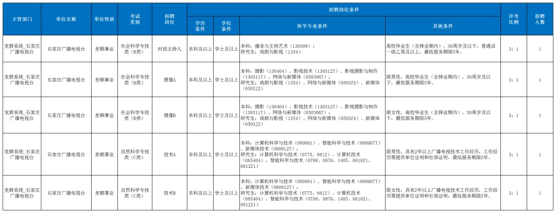 石家庄广播电视台招聘时政主持人等人才5名,岗位及要求详见下图: