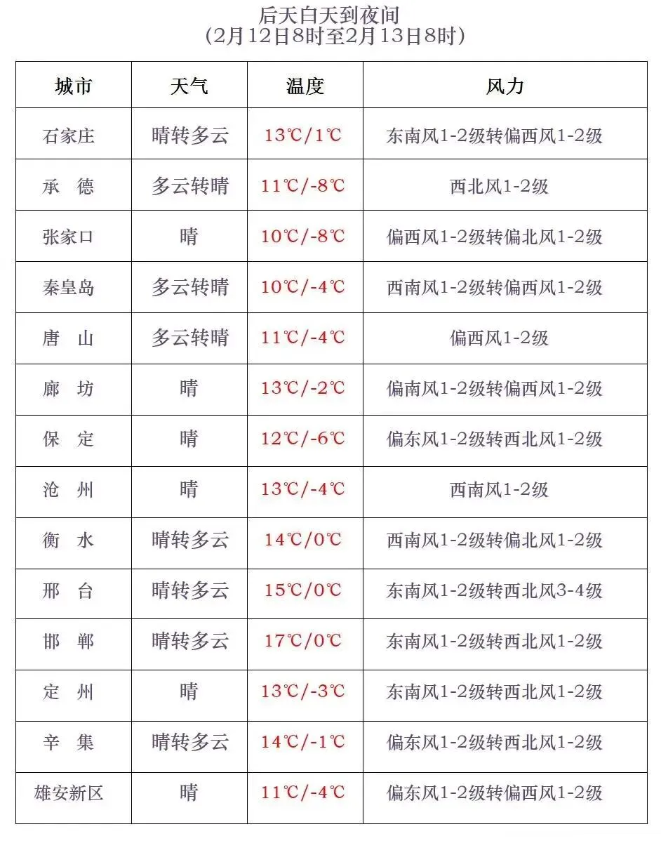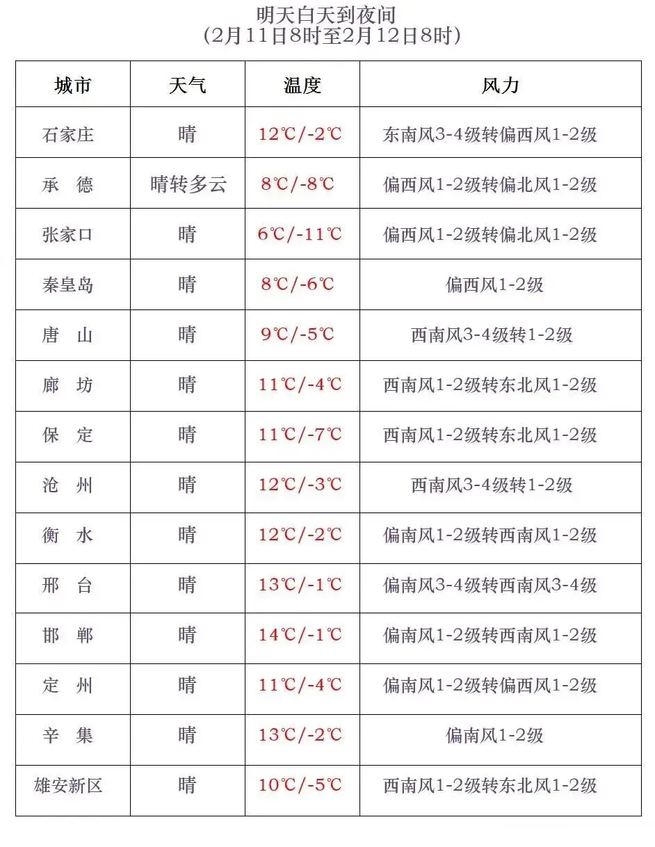 今天下午到夜间,张家口北部、承德北部多云转晴,其他地区晴间多云。最高气温,张家口大部、承德大部-1~8℃,其他地区9~15℃。最低气温,张家口中北部、承德大部、秦皇岛北部、保定西北部-20~-10℃,其他地区-9~0℃。