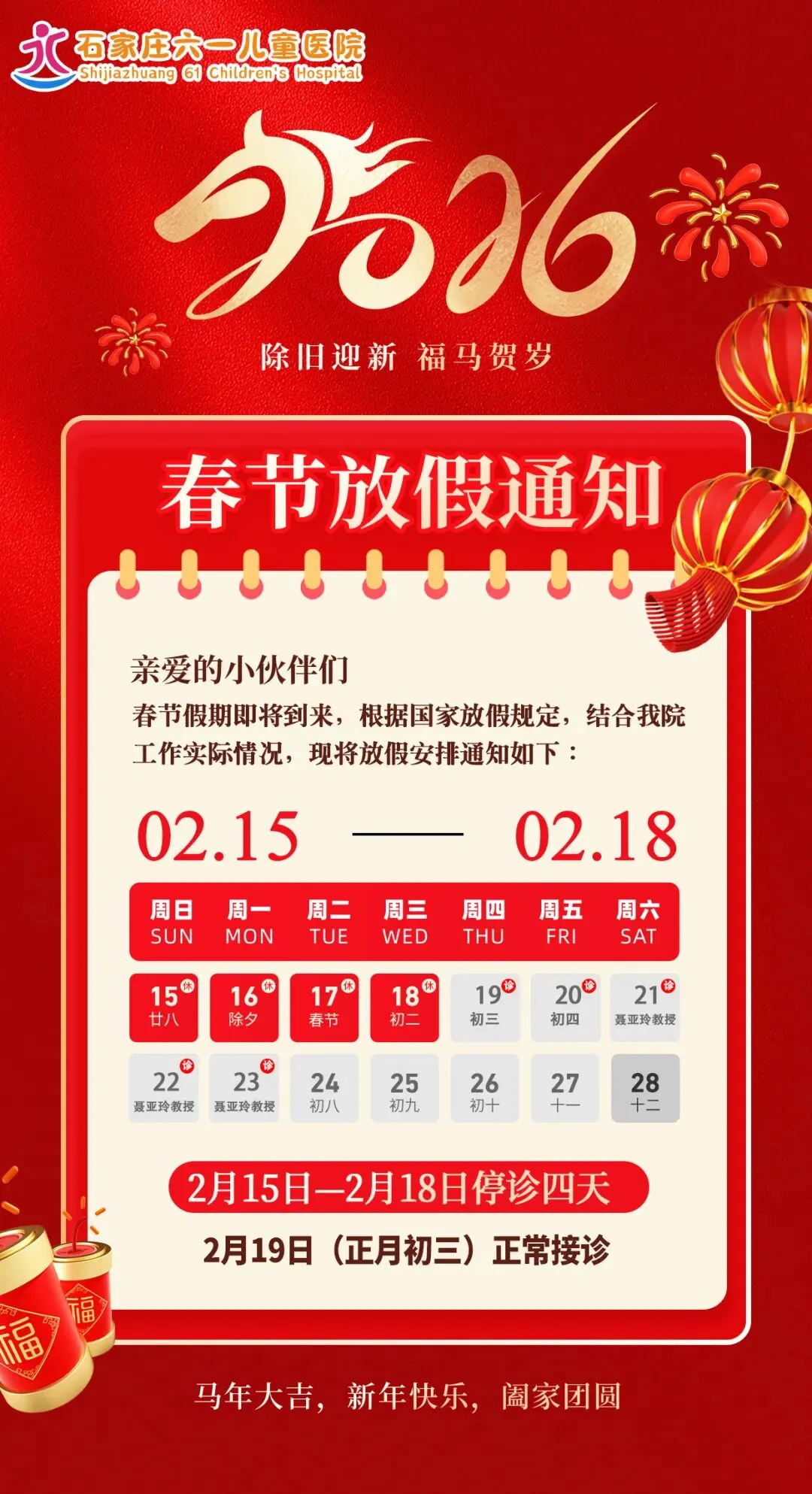 【春节放假通知】2026年石家庄六一儿童医院春节放假安排及温馨提醒!