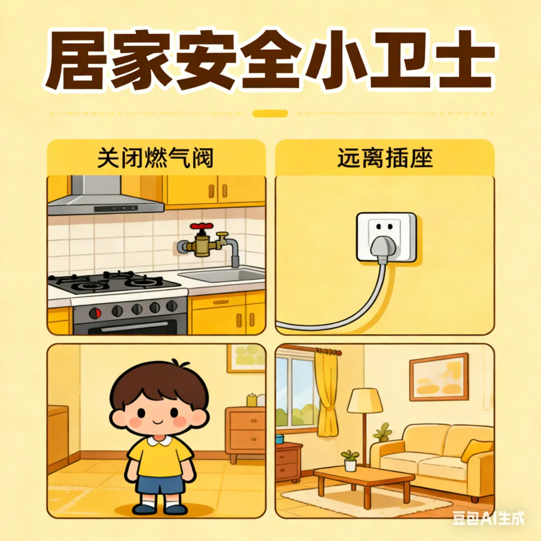 收好剪刀、药品等危险物品,不让孩子独自接触水电燃气;不给陌生人开门,防范居家安全隐患。