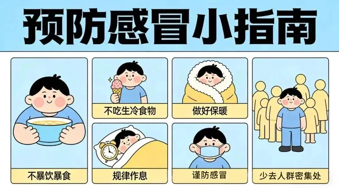 注意饮食均衡,不暴饮暴食、不食生冷不洁食物;做好保暖,规律作息,少去人群密集处,谨防感冒等疾病。