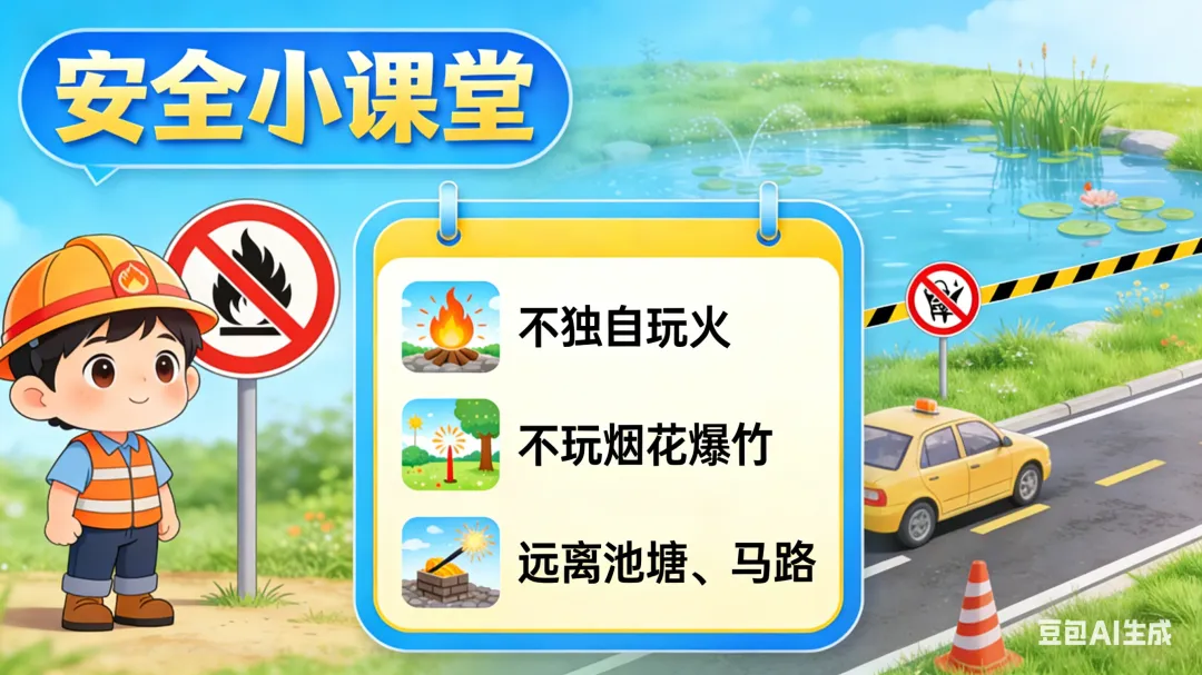 不让孩子独自玩火、玩烟花爆竹,远离池塘、马路等危险区域,守护宝贝平安。