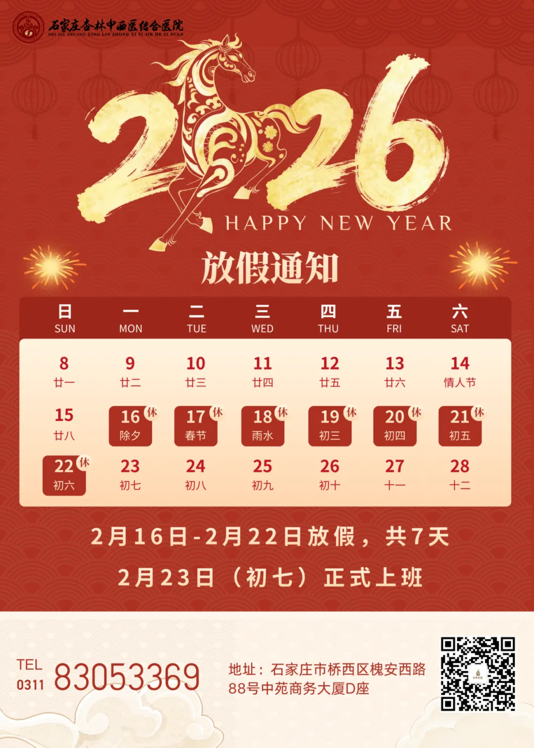 【春节健康不打烊】石家庄杏林中西医结合医院 2026年春节就诊安排