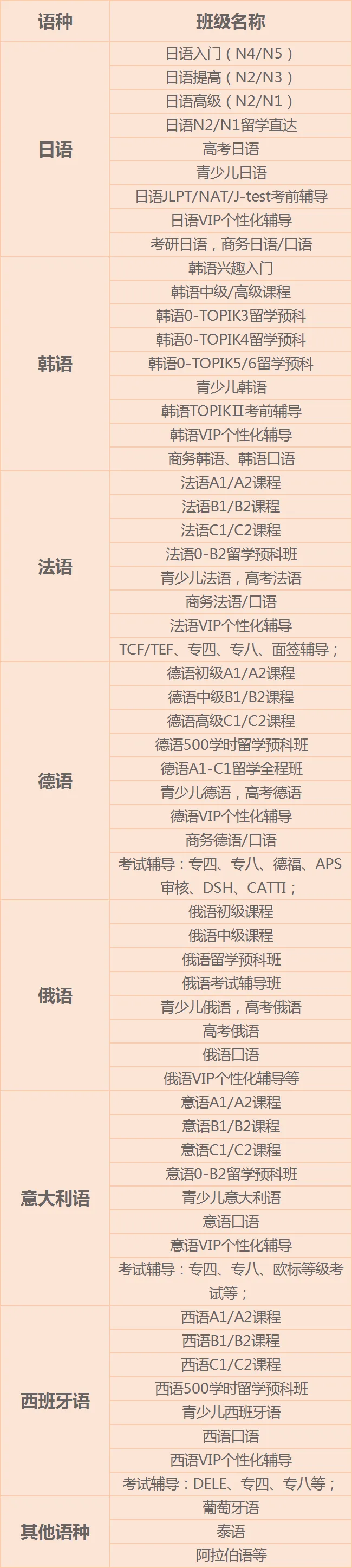 日语、韩语、法语、德语、俄语、西班牙语、意大利语、阿拉伯语、泰语、葡萄牙语等;