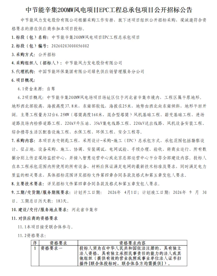 >河北石家庄200MW风电EPC招标