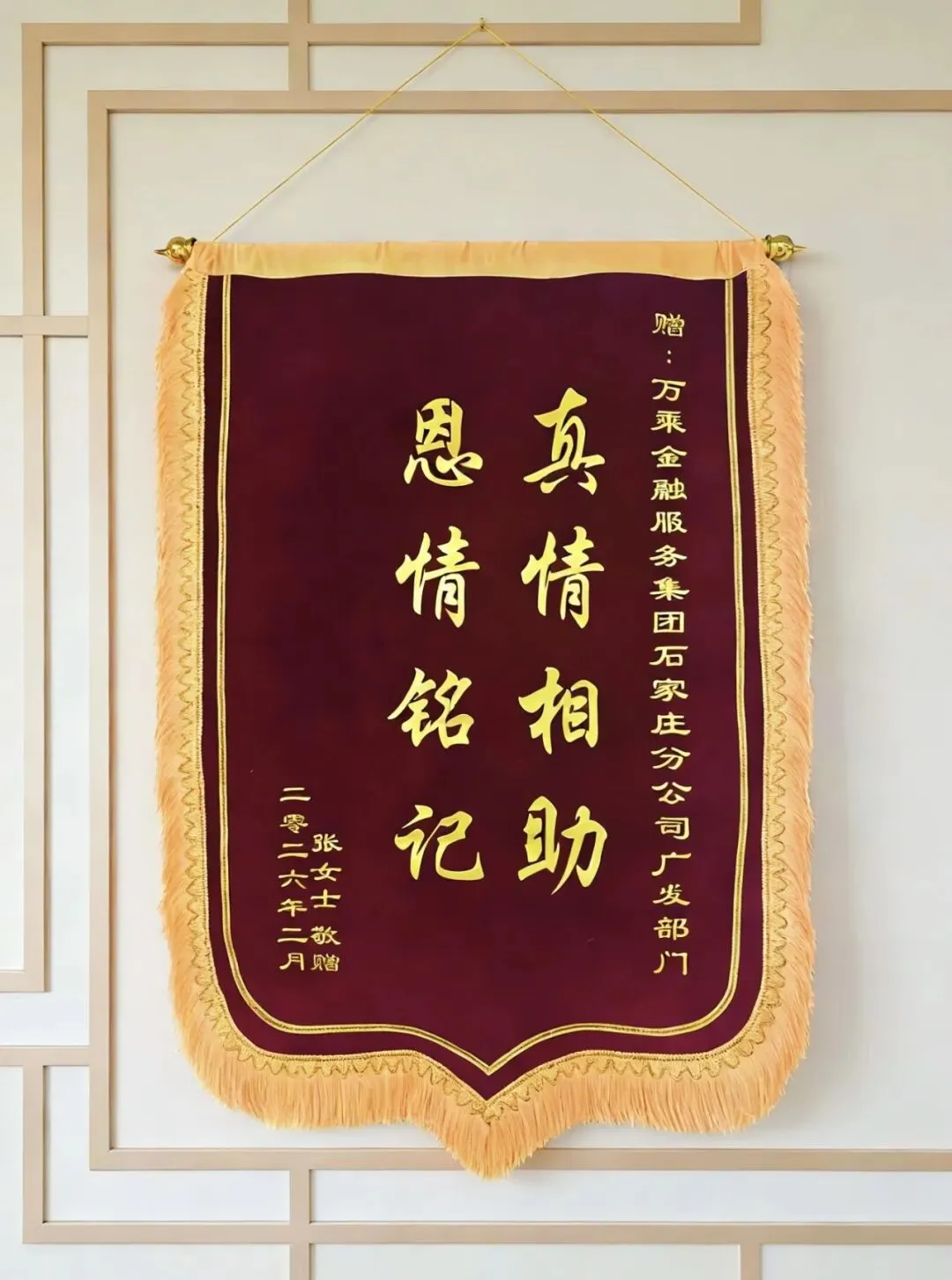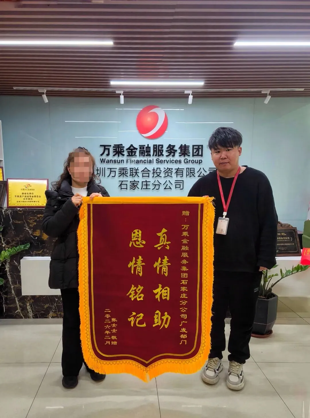2026年2月10日,石家庄万乘的大厅里暖意融融。广发客户张女士专程到访,将一面绣有“真情相助,恩情铭记”的锦旗,郑重送到了广发部门的同事手中。