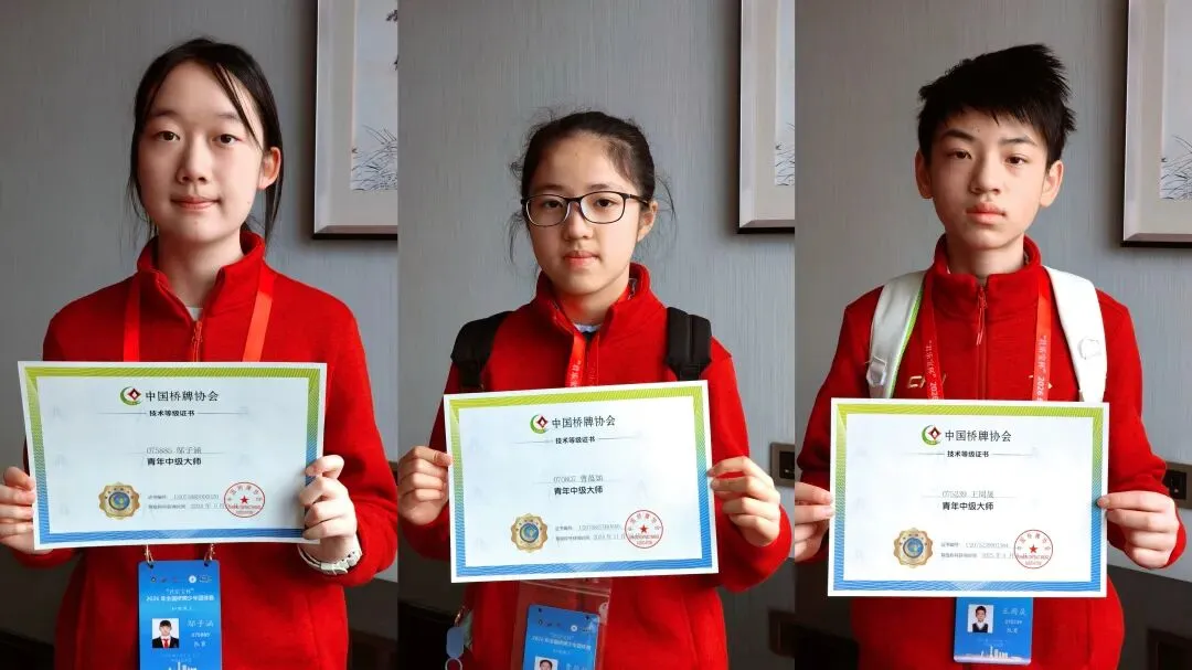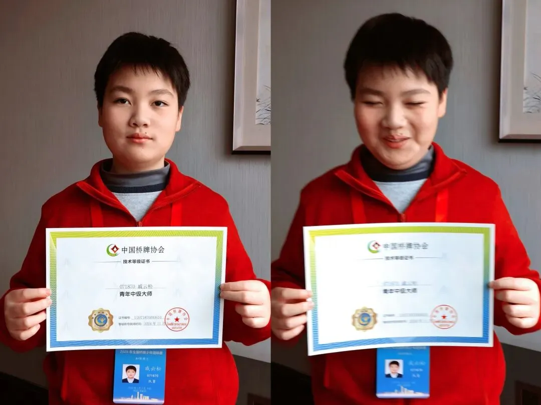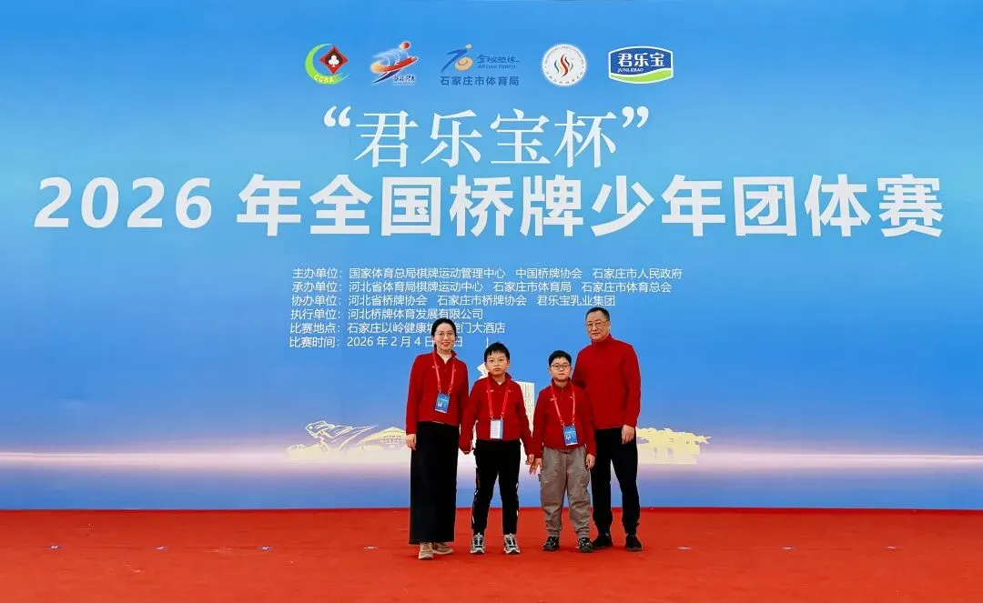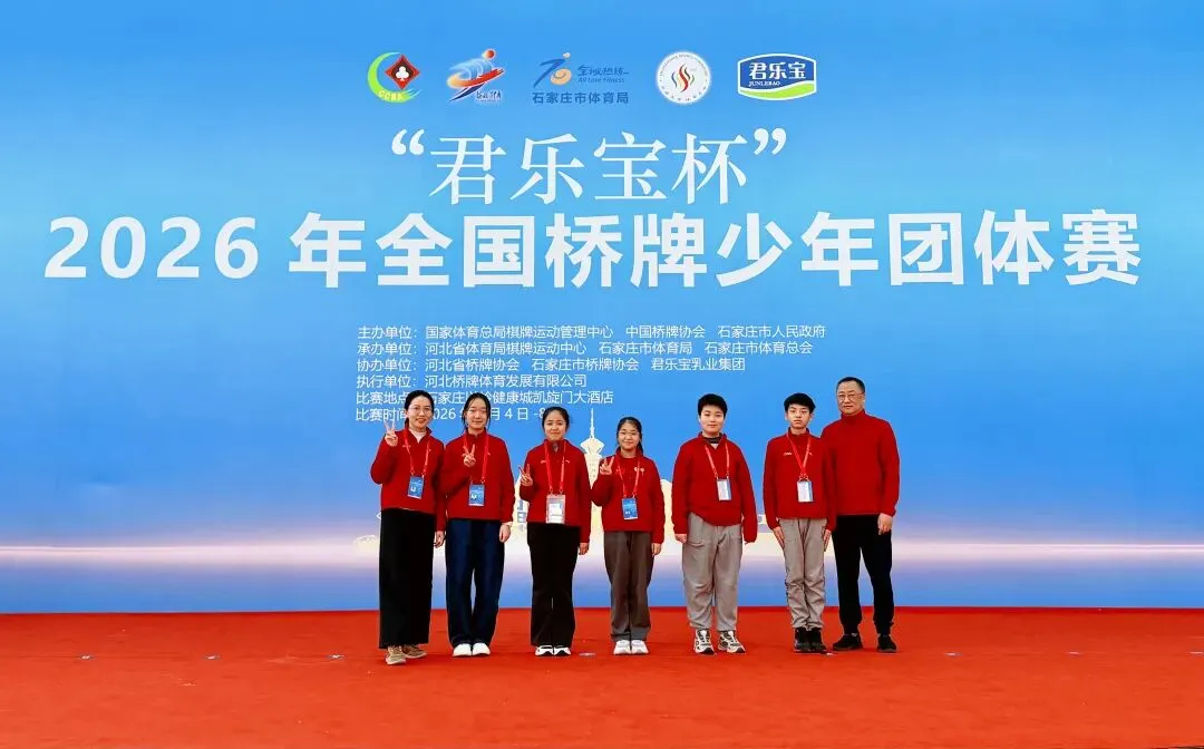 今年出发前,我们太幸福了——因为我们抢到了赛事酒店的房间!你可能不信,等待开放预订那几天,我出门办事都背着电脑,像揣着个不定时炸弹。终于刷到官网开放订房时,我的手是抖的,心是悬的,邮件是闭着眼点击发送的。直到接起那个归属地为河北的电话,听到“确认成功”四个字,那块悬了许久的石头,终于“咚”的一声,稳稳落地。如果用“简单粗暴”的数字命名,大家总觉得1队最强。为了避免产生顾此失彼的偏差感,这回让DeepSeek出了一些方案。▲左起:Rory领队,邬子涵,曹蕴如,陈紫菡,戚云松,王周晟,王维教练▲中国桥牌协会非常贴心,把证书和徽章带到赛场发给大家大伙儿在石家庄聚餐聊天时,才发现他们和队名的契合之处。王:王周晟,俱乐部外号“小电脑”,复杂的约定叫熟稔于心,妈妈是清华大学高材生(静教院预初在读)Miss 墩:陈紫菡,对桥牌有着坚定的信念,胸前仪式感拉满别着国旗、青年中级大师等徽章,并且拒绝吃银色包装的巧克力(宁波世外5年级在读)Mr 墩:戚云松,俱乐部一哥的存在,坐高铁都能被不认识的人喊出名字(延安初预初在读)两个墩墩,其实都还够得着U13(13岁以下)的门槛。但他们对桥牌的热爱,早已拆掉了年龄的标尺,重新定义了“稚嫩”的含义。站在U16的队伍里,他们带着超越年龄的赤诚。花儿与少年,只管勇往向前!▲左起:Rory领队,李欣妍,王心怡,余晨欣,田毓嘉,王维教练当四位女生用这个队名走进赛场,她们并不知道,这名字将在接下来的日子里,被她们自己赋予双向奔赴的生命力。首先是田毓嘉,她的名字里藏着那个“+”;王心怡、李欣妍、余晨欣——三人名字里都含着“心/欣”。接着,王周晟一语道破天机:“三个⭐,三角形最稳定!”直接呼应了队名中的“稳稳”。而这还不是全部的巧合。王心怡和李欣妍在报名时发现,她们同年同月同日生。俱乐部则恰好为她们订到了四间连号的房间——同进同出,心心相印。一切仿佛被悄悄安排好了。正如王维教练常对孩子们说的那句解压箴言:“最终的输赢结果老天早就给你们定好了,你们只管努力打好手上的每一副牌。”这支队伍和北京臻禾桥牌俱乐部联合组队,武谦屹是朱乙蓦老搭档贺思涵的同班同学,相较于朱乙蓦的丰富赛事经验,武谦屹还是第一次参加全国比赛。▲2025年,贺思涵和朱乙蓦合作拿下“奔跑吧·少年”全国桥牌少年智慧接力赛多项冠军武谦屹的父母一直希望,孩子能多一分胜负欲、多一分自驱力。这次与优秀的哥哥姐姐们并肩作战,身处真正竞技环境的他,被悄悄触动了。他的准备工作里,藏着所有的心事:桥牌书、桥牌杂志、桥牌笔记、扑克牌、叫牌盒,甚至足足打印了10张约定卡——把能带的、不能带的,全塞进了行李箱。我忍不住逗他:“是不是晚上把桥牌书垫在枕头下面,睡得才安心呀?”比赛前一晚,我和朱乙蓦、武谦屹待在一起。我望向朱乙蓦,抛出了三个问题。“武谦屹明天打牌犯错了,要严肃批评,还是耐心解释?”那个瞬间,我知道他已经明白了:teammates不是共享荣誉的人,而是分担风险的人。比赛期间,等待他们的是风雨还是彩虹?且听下回分解。谁不想要一个A+呢
