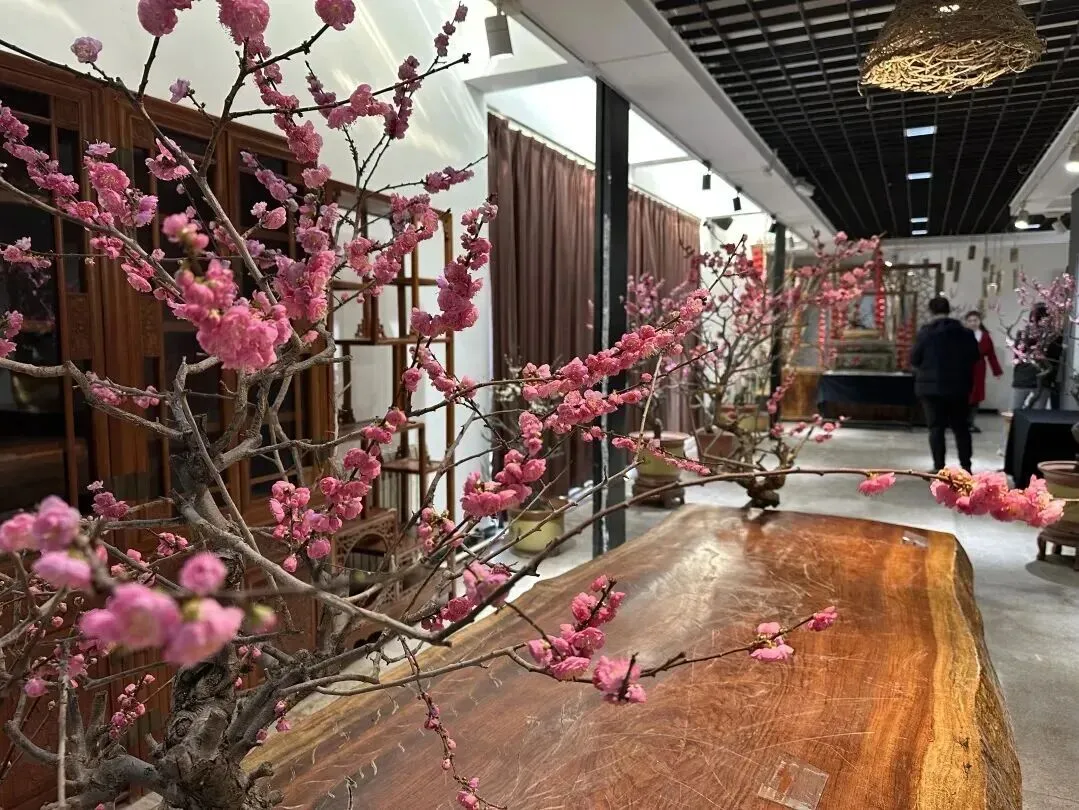 盆景园1号馆至4号馆内,近百盆蜡梅、美人梅、绿萼、宫粉等梅花盆景竞相开放,尽显古典梅韵雅致。盆景园5号馆同步举办组合盆栽展,以新品种仙客来搭配石斛兰、文竹、苔藓、枯木、奇石,打造13件园艺佳作,呈现“虽由人作,宛自天开”的园艺意境。