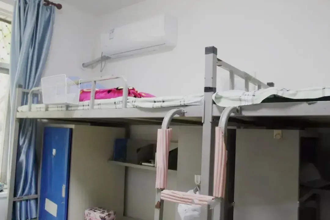 七人间宿舍是四张上下铺,储物柜在门口,房间内配有一台空调,四人间宿舍是上床下桌的形式,宿舍配备饮水设备。
