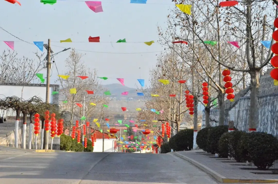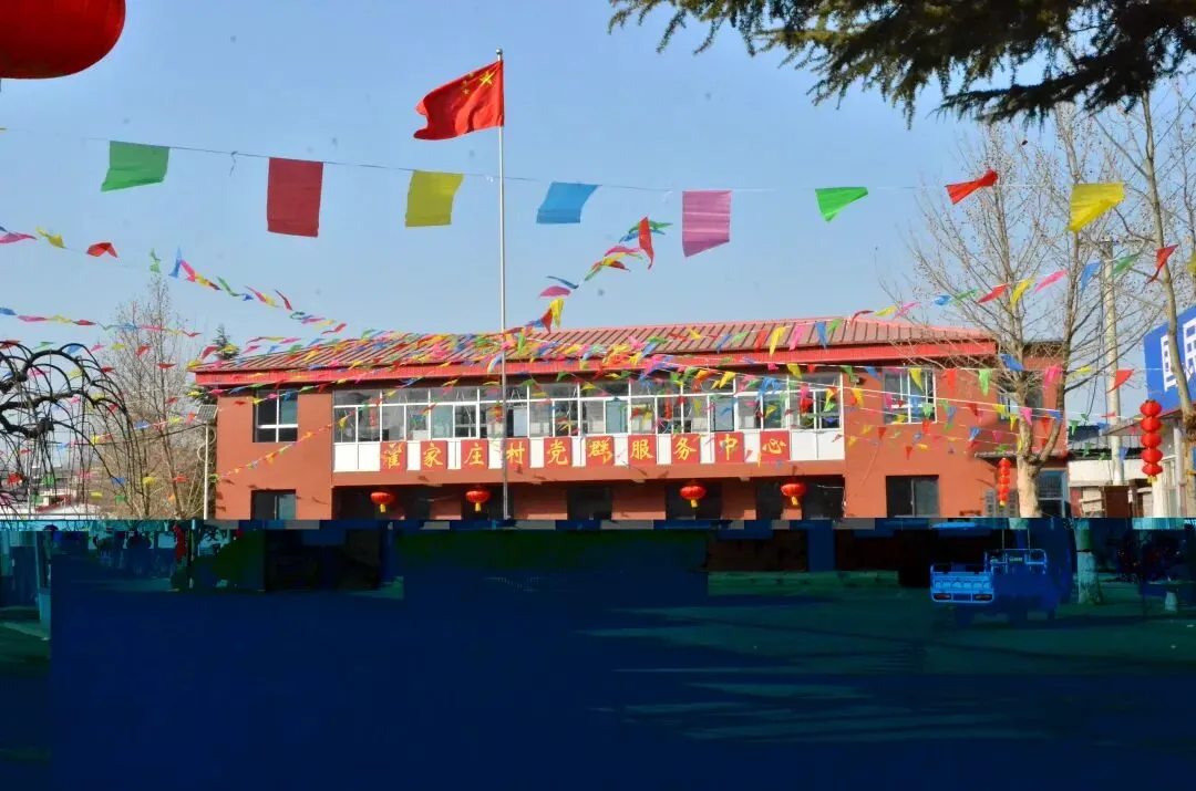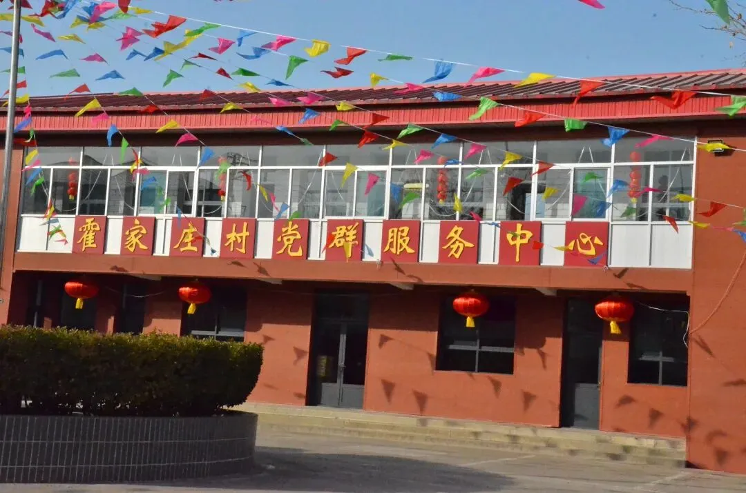的年味儿太足了!霍家庄的党群服务中心被五彩的彩旗和大红灯笼装点得喜气洋洋,蓝天作底,色彩饱和度极高,特别有北方乡村过年那种热烈、质朴的氛围感。