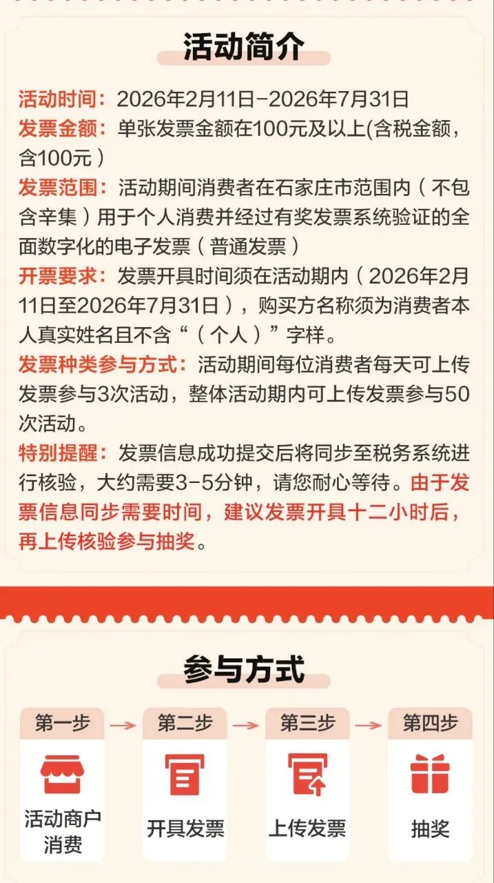 刚官宣!石家庄正式入选全国50城有奖发票试点,2月11日10点已经启动,总奖金2.6亿元、1172.5万个红包,春节到3月15日中奖率直接拉到80%。