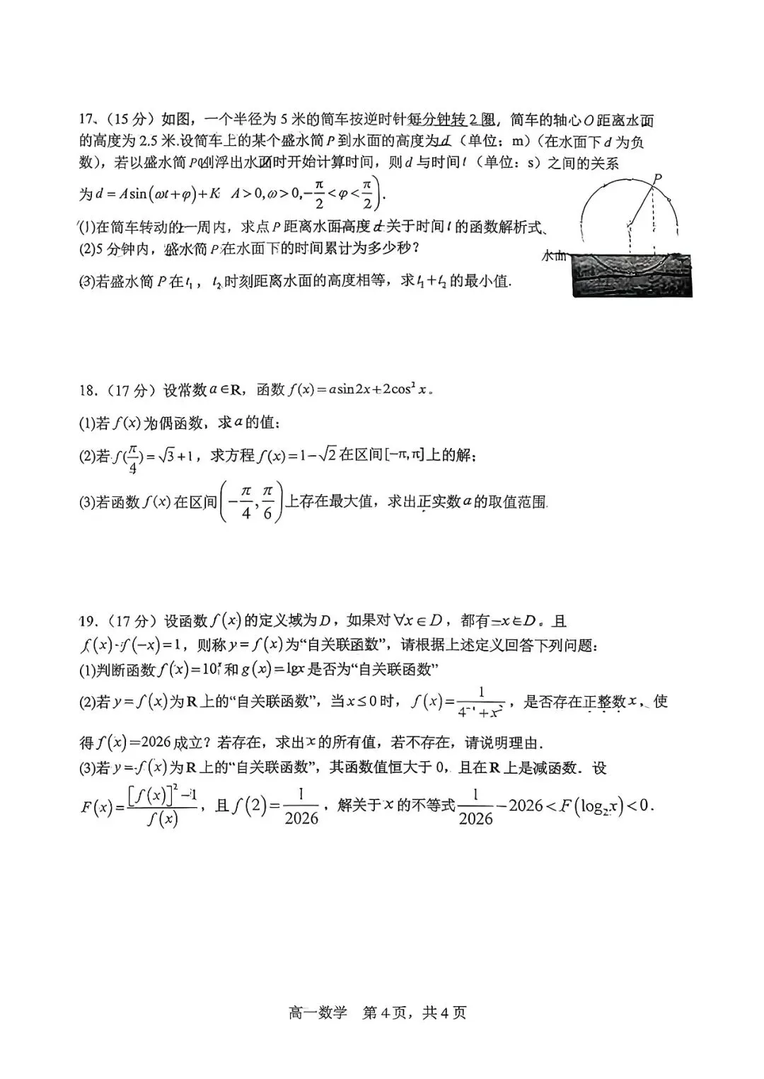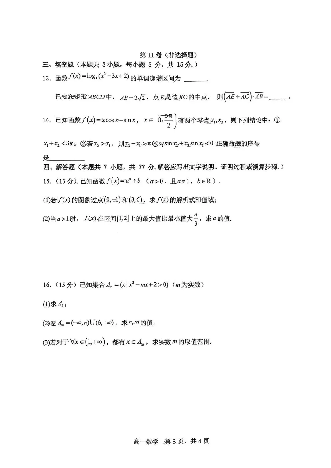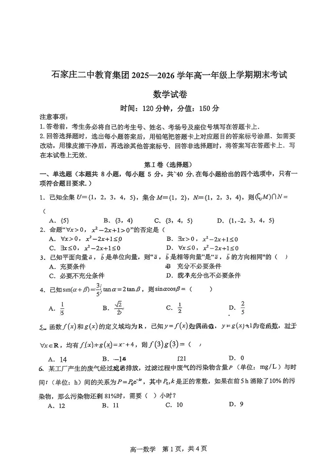 石家庄二中25-26年高一上册期末数学真题