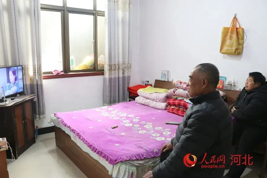 河北赞皇县墙板沟自然村民李占福和老伴儿在家看电视。人民网记者 祝龙超摄