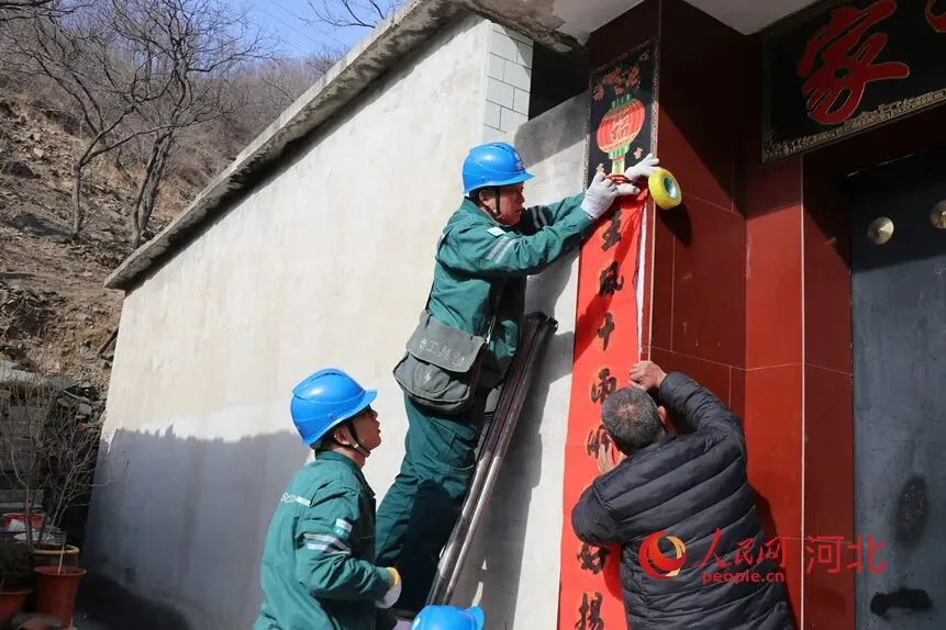 国网赞皇供电公司嶂石岩服务站贾立杰和同事在帮村民贴春联。人民网记者 祝龙超摄