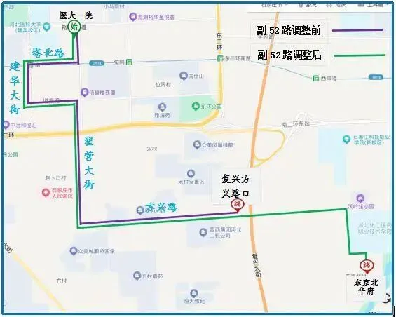 为进一步提升公共交通服务效能,精准覆盖西京北村、翡翠四季小区居民及河北化工医药职业技术学院学生的出行与购物需求,同时填补复兴大街以东、方兴路区域公交服务空白,拟对副52路进行调整,调整后线路编号改为55路。