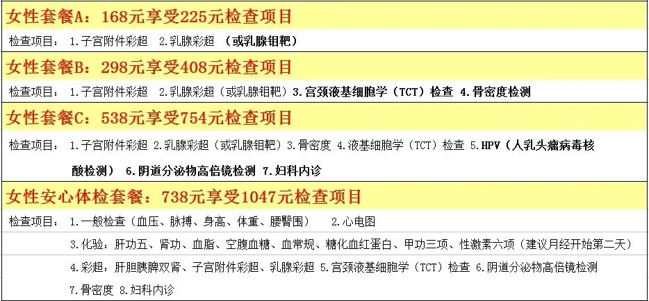 科室针对不同年龄人群以及身体健康状况,量身定制了多层次、个性化的体检套餐项目,涵盖经济实用的基础套餐及尊贵的全方位套餐,今后还将开展为每位体检者建立健康档案,制定长远的健康规划业务,全面满足体检客户的不同需求。