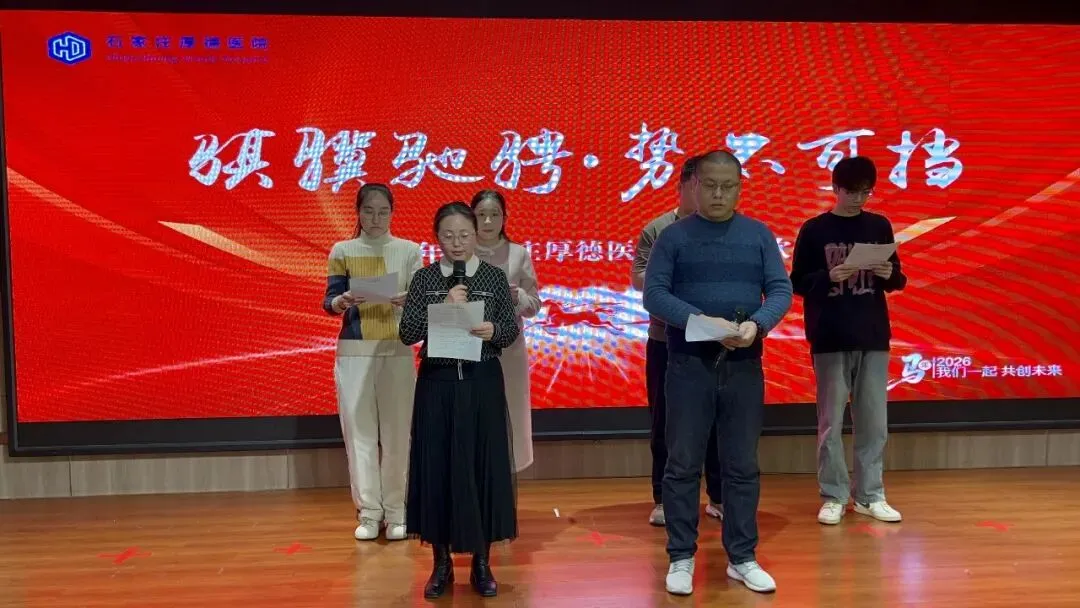 岁序更迭,新程启幕。2月12日下午,石家庄厚德医院2025年度总结表彰大会暨2026年工作部署大会隆重举行。特邀专家及全院领导职工欢聚一堂,回首2025年的耕耘与收获,共绘2026年的发展蓝图,以“骐骥驰骋•势不可挡”的昂扬姿态,共赴新程。