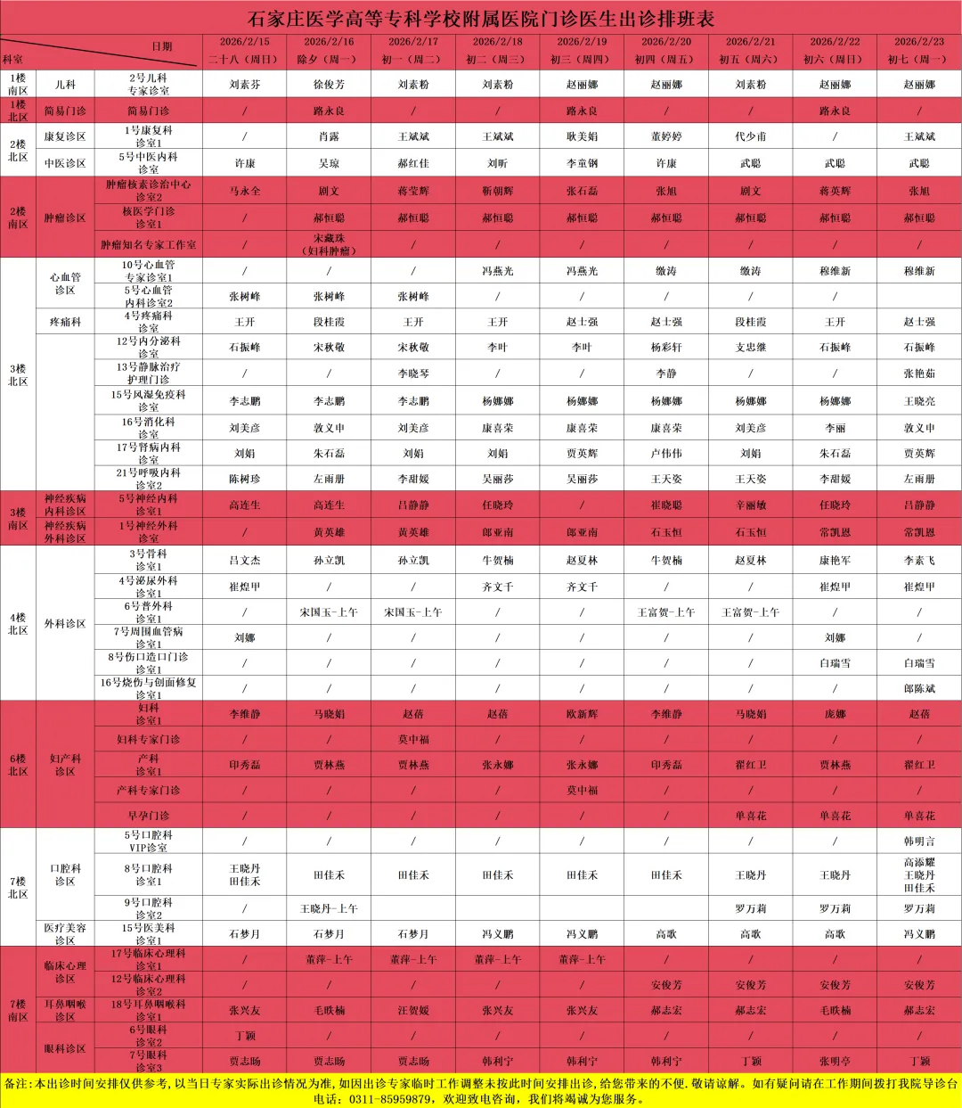 春节健康护航不打烊--石家庄医学高等专科学校附属医院2026年春节假期门诊医生排班表