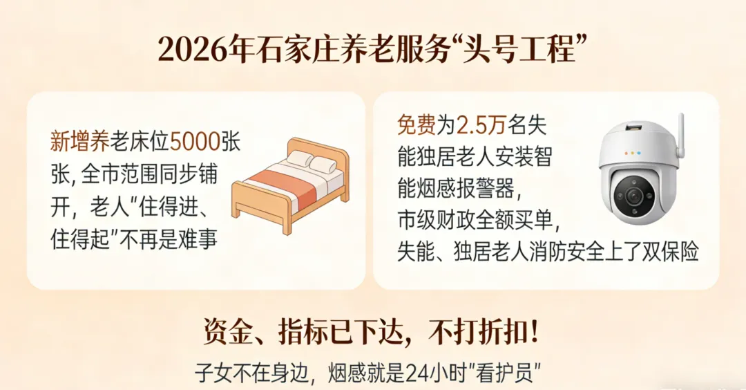 新增5000张养老床位、2.5万失能独居老人免费装烟感报警器、家庭医生上门送药……2026年,石家庄为老人准备的“大礼包”太实诚了!