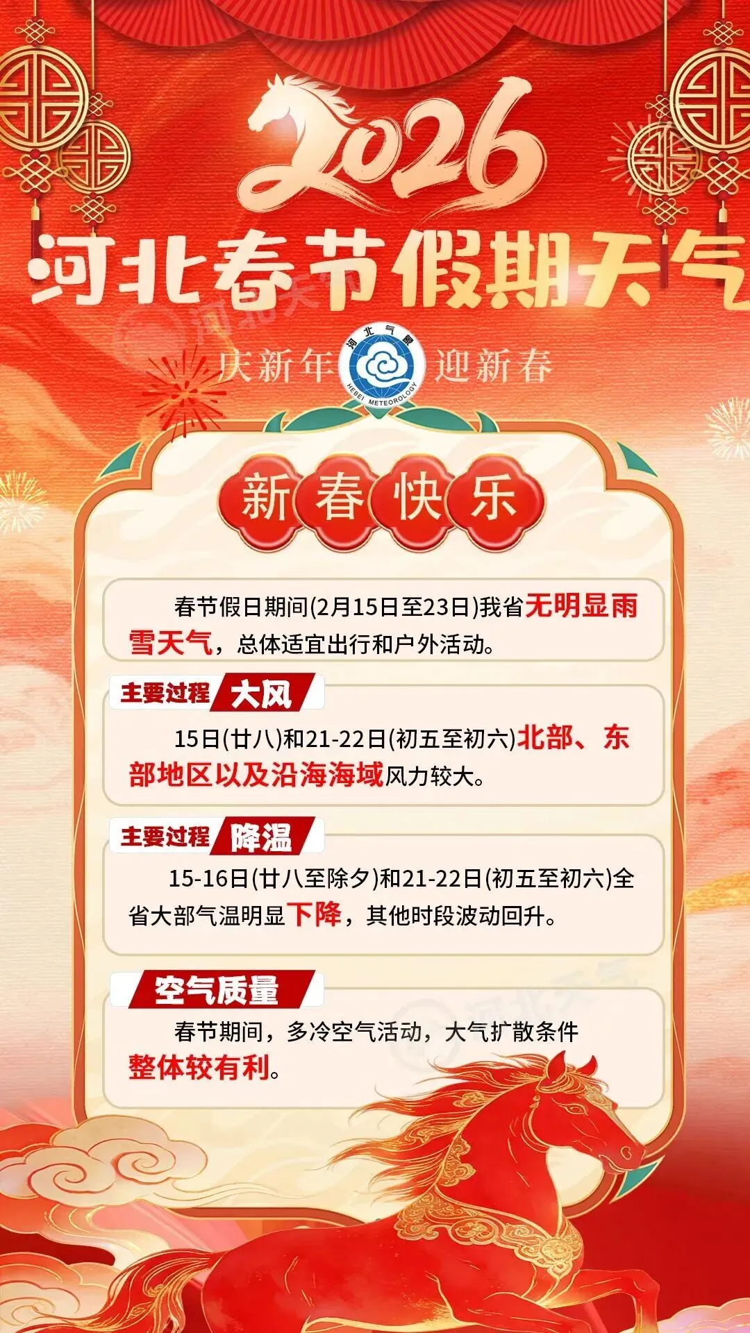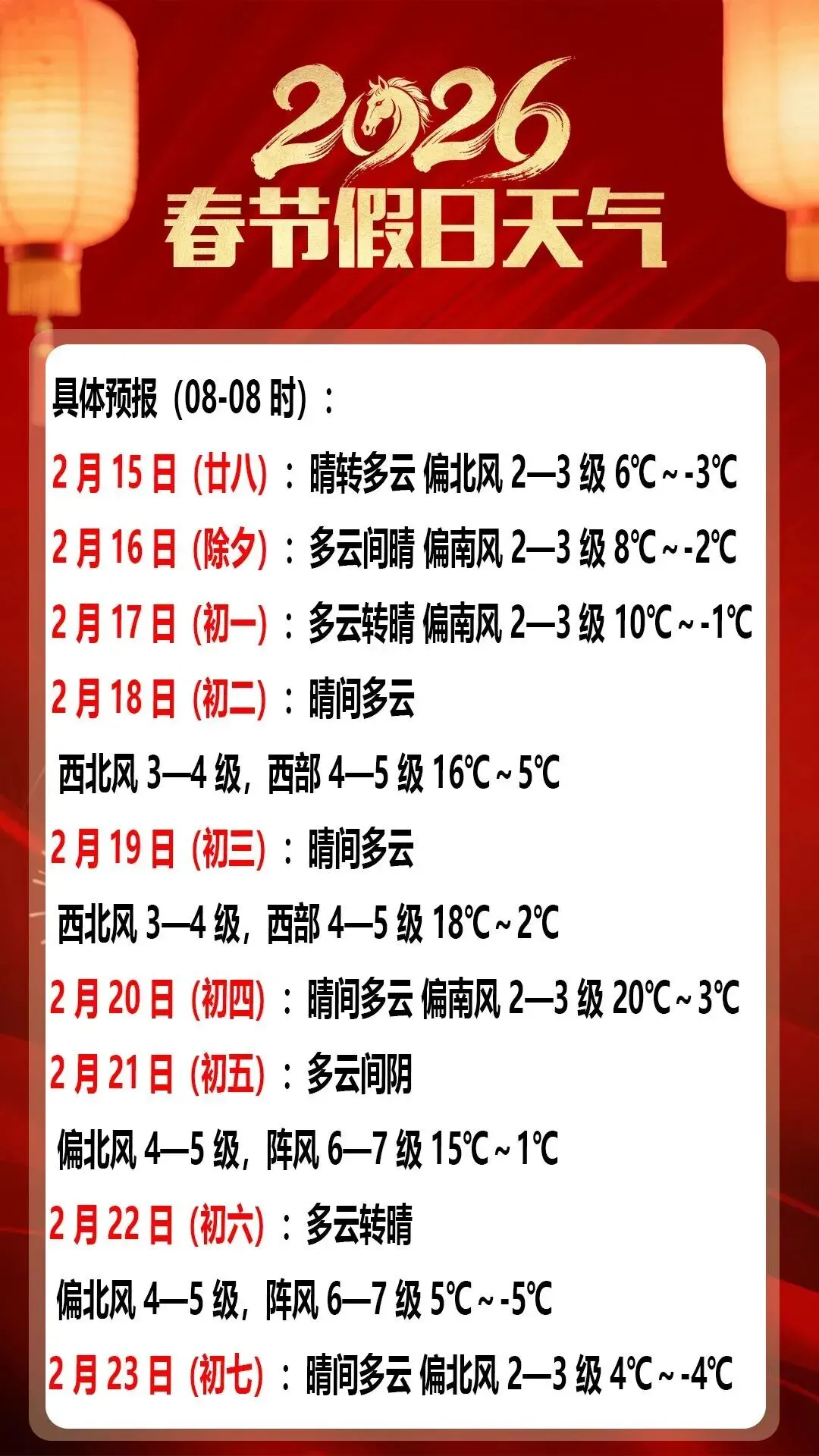 2月16日(除夕):多云间晴 偏南风2—3级 8℃~-2℃