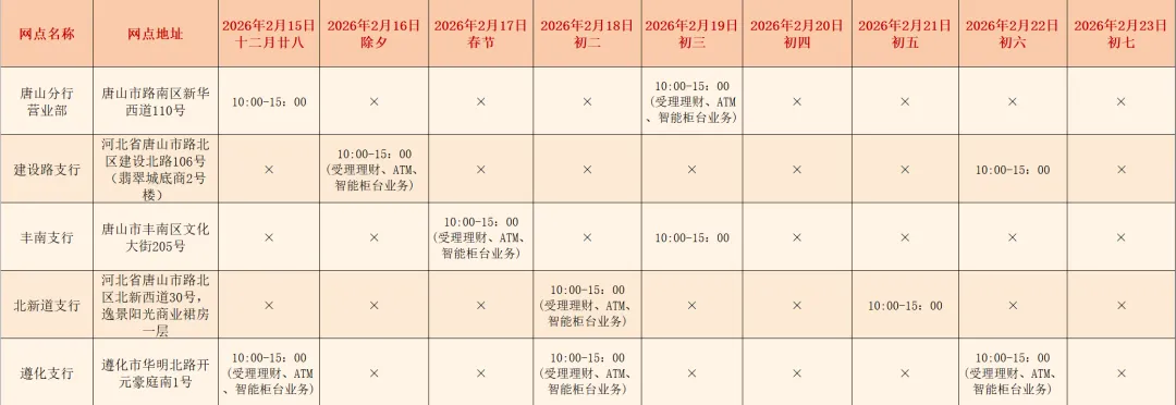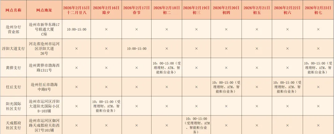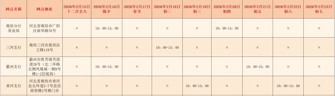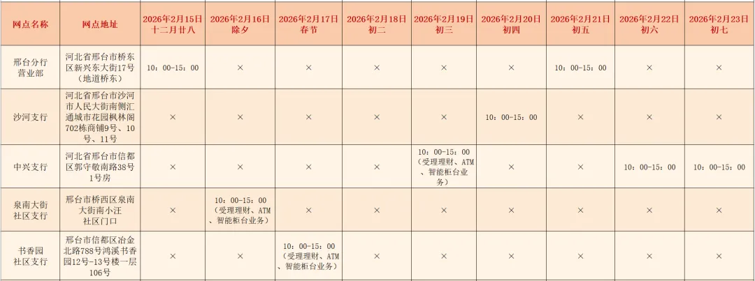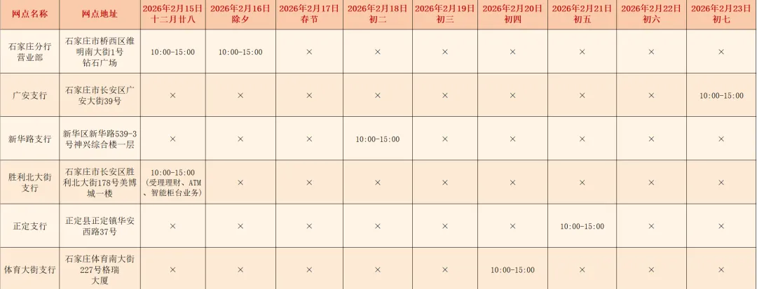 兴业银行石家庄分行2026年春节假期各网点营业时间安排