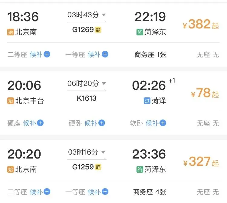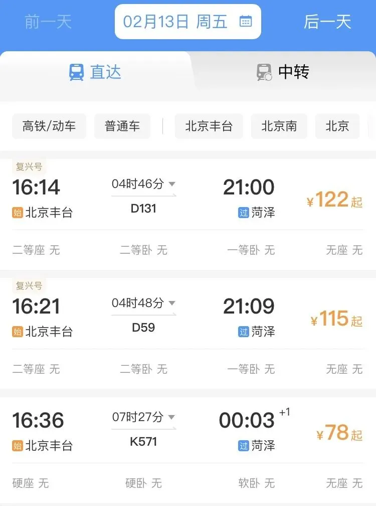 再看菏泽,北京有多辆到菏泽的直达火车~因外出务工人员巨多,春运期间还加开三班高铁,其中两班直达直达呀,中间不停车的,几个普通地级市能比往南也有菏泽始发到广东的车。菏泽站路线这么多,可能是因为地理位置优越,处于三省交界处,且铁路建设较早。从河北、京津南下的车,很多不走河南,甚至不走聊城,却大多过菏泽。还可能因为务工人员太多,多开几个班次也不赔钱~去年从南方回来过年,勉强挤上车,火车都快拉不动了,过了菏泽,车上就剩约一百个人,这就是菏泽站的实力所以有的车就走到菏泽,不再往北走到聊城济南,再走就接近跑空车综上,北漂往南走或者年后回北京就可以在这俩站转车附几个图看一下从石家庄买票有多容易。首先是今天从北京到菏泽的,截图于下午三点。