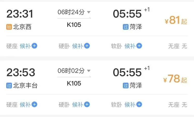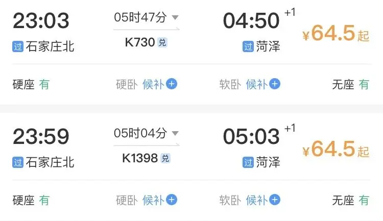 再看从石家庄到菏泽的。过两三站就可以一人畅享一排座位,硬座变硬卧,没有一点点春运气息