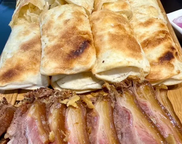 驴肉火烧:讲究“热火烧凉肉”或“全热”。面团要揉得软硬适中,抹上酥油,在饼铛里烙到两面金黄,再塞进炉膛里烤鼓起来。驴肉得是大锅慢炖的老汤肉,剁碎了夹进刚出炉的火烧里,浇上一勺老汤,那滋味,绝了。