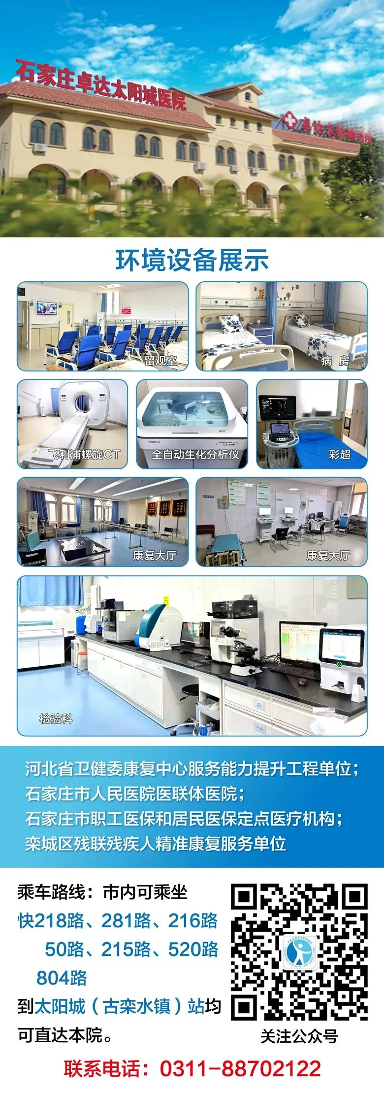 石家庄卓达太阳城医院坚持以“以病人为中心”的服务理念,以大专科(康复)小综合为办院方向,内抓技术及服务,外树形象;打造成群众信赖和满意的医院。
