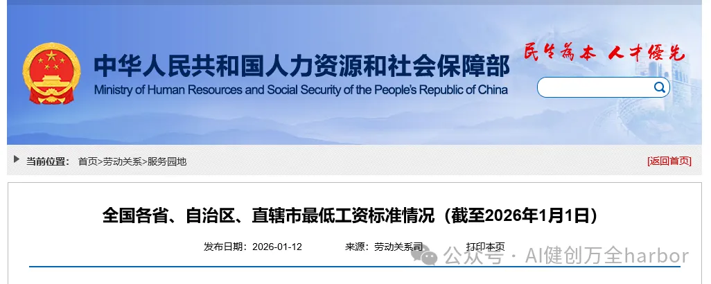 1月12日,人社部官网公布,全国各省、自治区、直辖市,最低工资标准情况。(截至2026年1月1日)