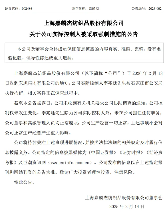 2月14日,上海嘉麟杰纺织品股份有限公司(002486.SZ)发公告称,公司于2月13日收到东旭集团有限公司的通知,公司实际控制人李兆廷被石家庄市公安局执行拘留,相关案件正在调查过程中。截至本公告披露日,公司未收到有关机关要求公司协助调查的通知,公司控制权未发生变化。李兆廷除为公司实际控制人外,未在公司担任任何职务,公司董事和高级管理人员均正常履职,公司生产经营一切正常,上述事项不会对公司正常生产经营产生重大影响。