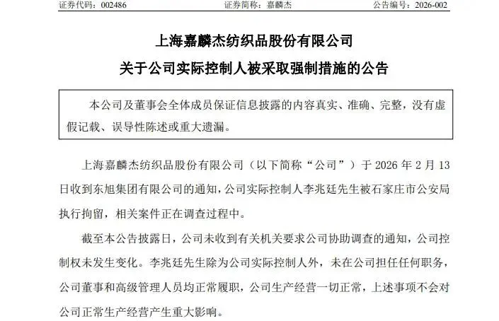 2026年2月13日晚间,一则简短的公告打破了资本市场的平静。上海嘉麟杰纺织品股份有限公司(股票代码:002486.SZ)正式披露,公司实际控制人李兆廷已被石家庄市公安局执行拘留,相关案件正在调查过程中。公告同时强调,李兆廷未在嘉麟杰担任任何职务,公司控制权未发生变化,生产经营“一切正常”,但这一表述难以掩盖市场对“东旭系”剩余上市平台命运的担忧。
