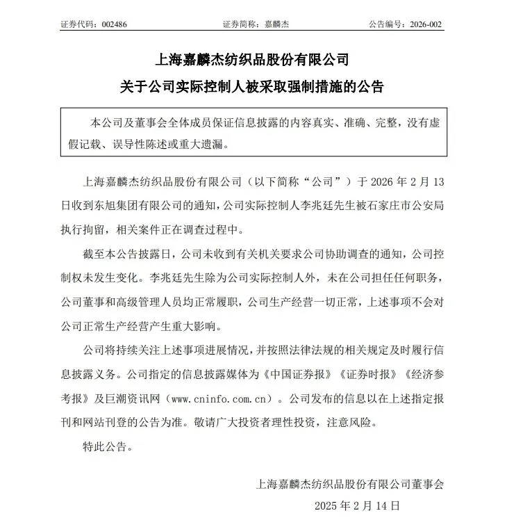 2月13日晚间,嘉麟杰披露公告称,公司于当日收到东旭集团有限公司的通知,公司实际控制人李兆廷被石家庄市公安局执行拘留,相关案件正在调查过程中。