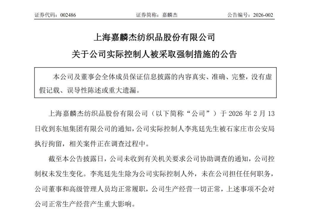 2月13日晚间,嘉麟杰(002486.SZ)披露公告称,公司于当日收到东旭集团有限公司的通知,公司实际控制人李兆廷被石家庄市公安局执行拘留,相关案件正在调查过程中。