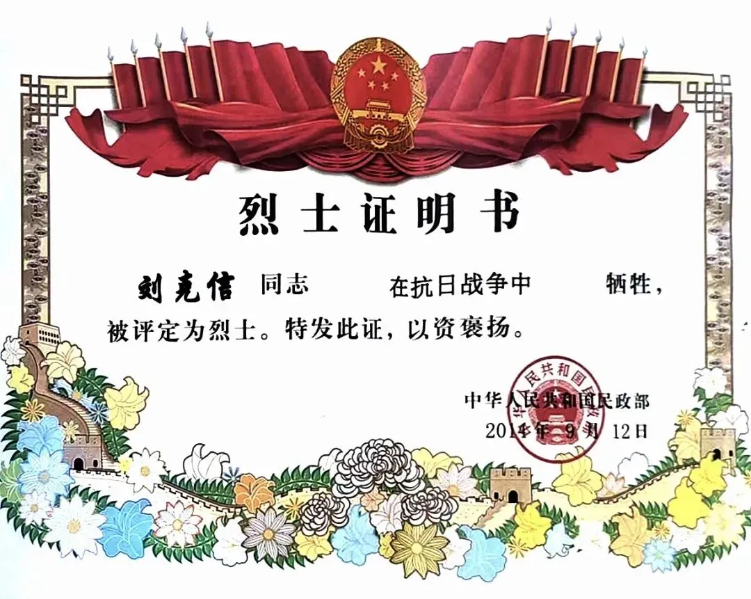 2015年8月24日,刘克信入选国家民政部公布第二批600名著名抗日英烈和英雄群体名录。