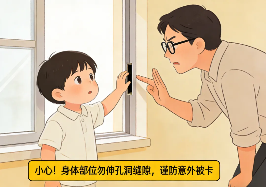 6.不单独留孩子在家,确有特殊情况需委托亲友、邻居或社区工作人员看护;叮嘱孩子不在飘窗、阳台嬉戏攀爬,不向窗外抛物,不将身体部位伸入孔洞缝隙,谨防意外被卡。若发生意外,立即拨打报警电话,保持冷静切勿慌乱挣扎,避免二次伤害。