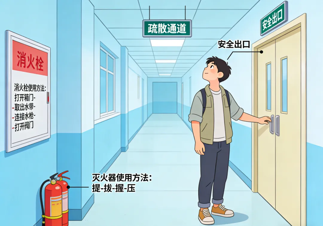 8.进入电影院、大型商业综合体、宾馆等公共场所,提前熟悉疏散通道、安全出口位置,牢记逃生路线,留意消火栓、灭火器等消防设施的位置及使用方法;宾馆住宿时杜绝卧床吸烟、乱扔烟头。