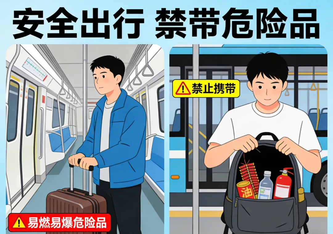 9.乘坐公共交通工具不携带易燃易爆危险品;自驾出行不占用应急车道,停车不占用消防车通道;游览文物古建筑、景区时,严格遵守防火规定,不前往未开发开放、缺乏安全保障的区域,谨慎参与高空、高速、涉水、探险等高风险项目。