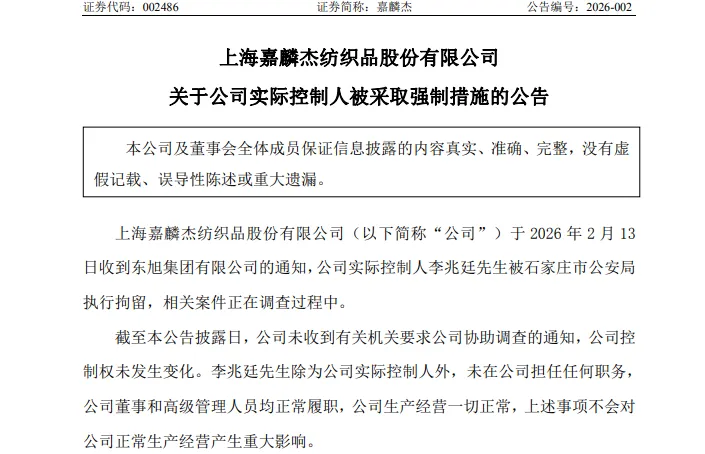 2月13日晚,嘉麟杰(002486.SZ)公告称,公司于当天收到东旭集团有限公司的通知,公司实际控制人李兆廷被石家庄市公安局执行拘留,相关案件正在调查过程中。截至本公告披露日,公司未收到有关机关要求公司协助调查的通知,公司控制权未发生变化。李兆廷除为公司实际控制人外,未在公司担任任何职务,公司董事和高级管理人员均正常履职,公司生产经营一切正常,上述事项不会对公司正常生产经营产生重大影响。