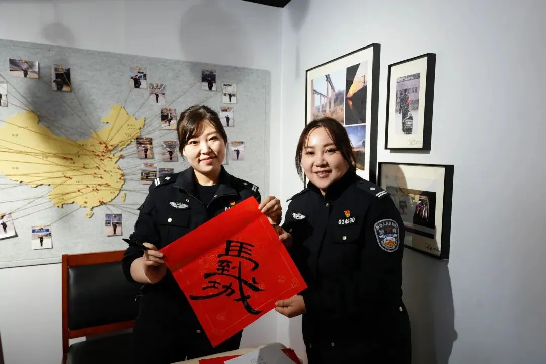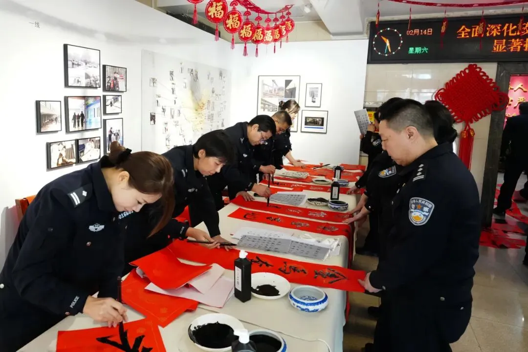 写春联区域墨香四溢、文韵悠长。红纸铺展,警营书法家们挥毫泼墨,一副副寓意吉祥的春联和福字跃然纸上。