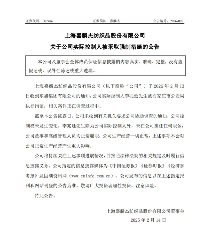 上海嘉麟杰纺织品股份有限公司发布公告:公司实际控制人李兆廷,已于当日被石家庄市公安局执行拘留,相关案件正在调查中。这一天,距离李兆廷成为石家庄首富已经过去七年,距离东旭光电退市不到两年,距离他被证监会立案调查刚好11个月。公告没有说明拘留的具体原因,但市场普遍认为,这标志着相关证券违法案件从行政追责升级为刑事调查。从证监会立案,到行政处罚,再到公安拘留,一条完整的追责链条已经形成。石家庄,这座李兆廷事业起步的城市,如今成为他命运的终点。1986年,他从河北工业大学毕业,被分配到石家庄市柴油机厂;消息传出后,嘉麟杰股价应声下跌。这家东旭系唯一剩下的上市公司,股价只有3.16元,总市值约26亿元,已经岌岌可危。从掌控三家上市公司的资本帝国,到实控人被拘留、仅剩一家上市平台苦苦支撑,李兆廷的兴衰落幕令人唏嘘。他的妻子李青,那个真正创办东旭的技术大脑,如今在这个故事里几乎消失了身影。或许在资本狂欢的某个时刻,她也曾试图提醒,但最终被丈夫的野心所淹没。东旭集团总部大楼依然灯火通明,员工们照常上下班,只是再也没人提起那个曾经坐在顶层办公室的人。在看守所里的李兆廷,不知道是否会想起1997年那个辞职下海的夏天。那时候他才32岁,意气风发,带着妻子李青和十几个技术人员,在一间民房里开始创业。那时候的梦想很简单:做中国自己的液晶玻璃基板,打破外国垄断。2026年2月13日,情人节前夜,石家庄市公安局的大门关上了。这是李兆廷用一生写下的教训,也是所有企业家应该铭记的警示。【声明】本文基于公开信息进行创作,部分细节采用合理推测和文学化演绎。文中涉及人物经历、事件等均来源于官方报道及公开资料。如涉及内容与事实有出入,以官方通报及权威报道为准。)