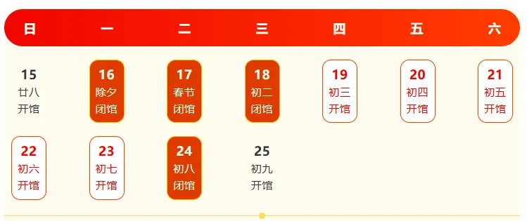 2月15日(腊月二十八)、2月16日(除夕)全天闭馆;