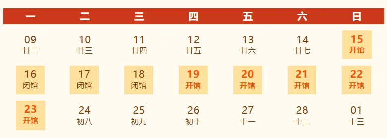 春节假期(农历腊月二十八至正月初七)全程不闭馆,每日开放时间如下: