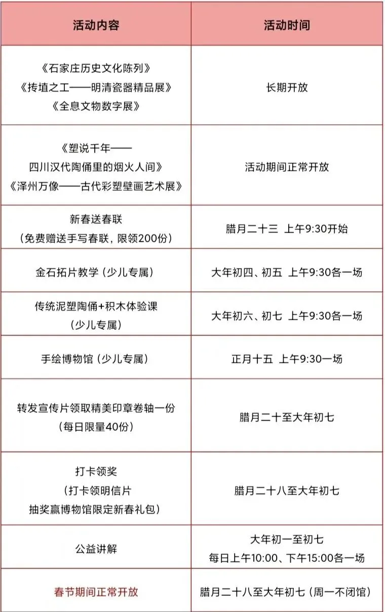 2026年春节假期将至,为满足广大观众朋友假日文化需求,石家庄城市馆春节期间开放安排如下: