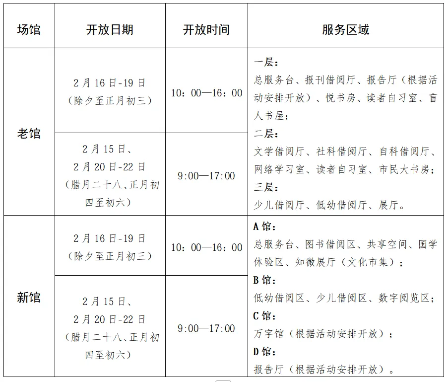 2026年春节假日,石家庄市图书馆新老两馆开放安排如下: