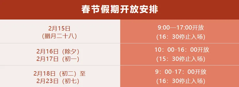 2月15日(腊月二十八)闭馆,2月16日(除夕,周一)、2月17日(初一)开放时间为10:00—16:00(15:30停止入馆),2月18日(初二)至2月23日(初七)正常开放,开放时间为9:00—18:00(17:30停止入馆)。